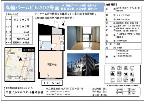 〈マンション・アパート〉 【NEW!!】高輪パームビル 302号室(賃貸マンション)